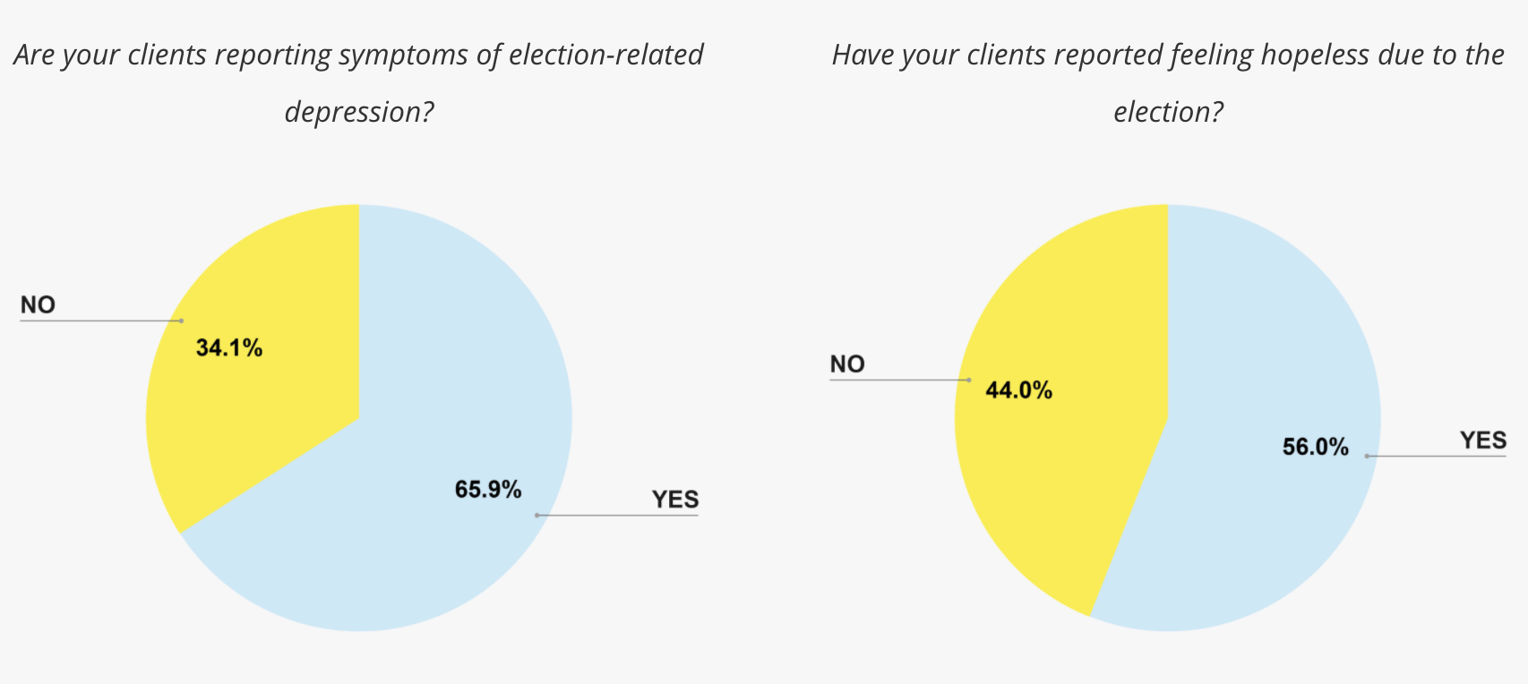 Nearly 66% of respondents said their clients have reported depression symptoms related to the election and 56% said their clients have reported feeling hopeless about it.
