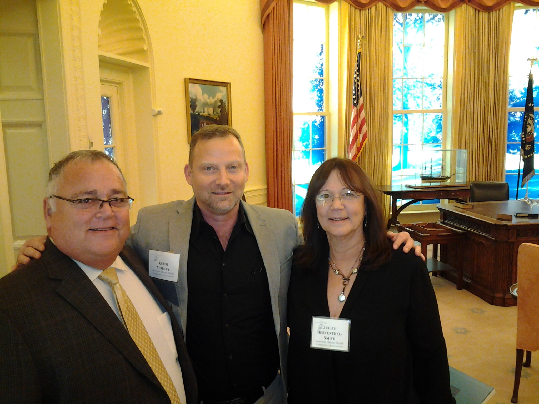 AMHCA Board President, Stephen A. Giunta, Ph.D., President-Elect, Keith Mobley, Ph.D., and Past President Judith Bertenthal-Smith in the replica of the oval office at the Jimmy Carter Presidential Library and Museum at the at the 30th Annual Rosalynn Carter Center Symposium on Mental Health Policy in Atlanta, Georgia.