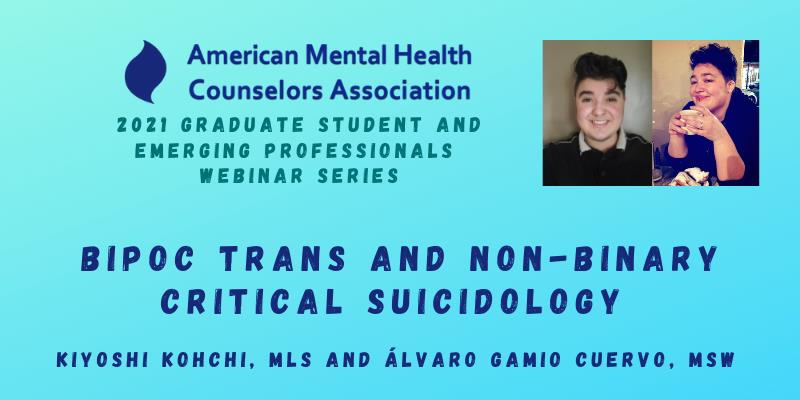 Historically, trans people and folks of color have not been represented in the creation of mental health counseling and the field of psychology. The lack of inclusion of TPOC extends to our conceptualization of suicide and structural responses to caring for TPOC within chronic suicidal thoughts and behaviors, and a lack of acknowledgement of how systemic oppression impacts suicidality in TPOC. Conceptualizing suicidality and suicide prevention within an anti-oppressive framework is essential in understanding how transgender individuals of color experience and cope with long-term, chronic suicidal thoughts and behaviors. Through our work at Trans Lifeline and other crisis/clinical work, we practice a harm reduction, community-based response to suicidality and other serious mental health concerns within the trans community. Our aim for this presentation is to bridge our practice and academic training to offer a new perspective of caring that is less punitive and more restorative. By engaging in this presentation, participants will be able to (1) identify anti-oppressive models of suicide such as intersectional and social justice models, (2) describe how discrimination and minority stress influence suicidality for TPOC, (3) think critically of how medical models of suicide and oppressive suicide prevention responses involving the police, mandated reporting, and forced hospitalization harm TPOC, (4) identify one way that you can alter your clinical and crisis practice to better serve trans and non-binary BIPOC who experience chronic suicidal thoughts and behaviors.